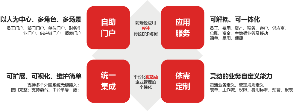 通過財務共享服務平臺系統的實施,建立集團統一財務共享平臺,實現自助門戶、主數據服務、管控規則定義、集團組織管理、預算、員工報銷、商旅服務、供應商、客戶、資金、稅務、總賬、審計監督等一體化的工作中臺,同時實時與集團各公司協同辦公平臺、郵件系統、APP等無縫集成,實現集成化的共享服務平臺。