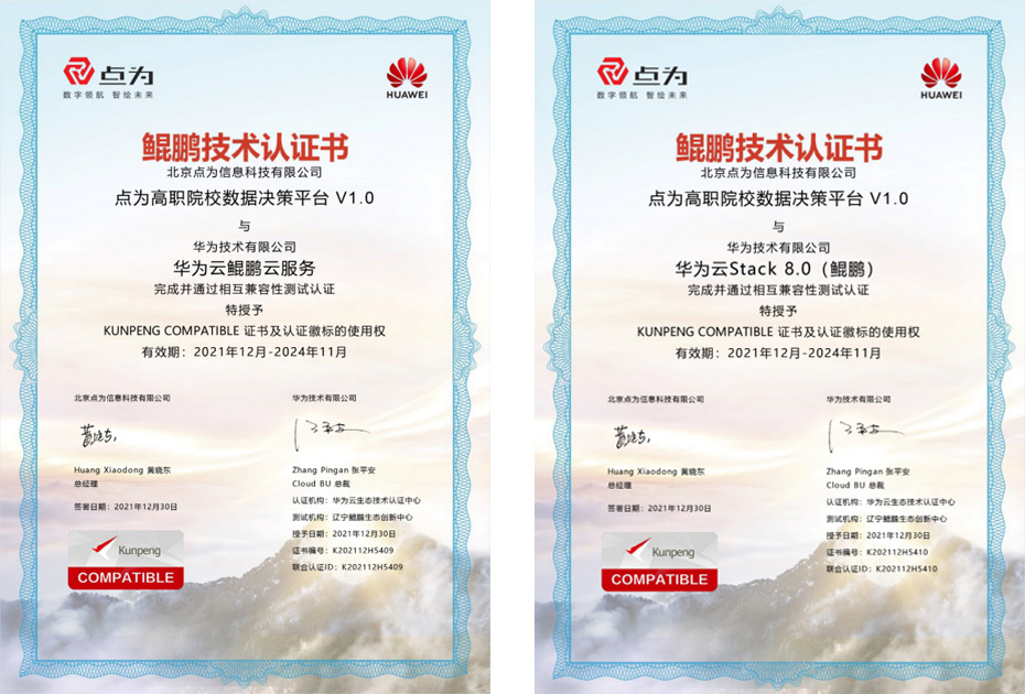 12月30日,經(jīng)過多維度嚴(yán)格驗證,點(diǎn)為旗下的“高職院校數(shù)據(jù)決策平臺V1.0產(chǎn)品”完成了與華為云Stack8.0的兼容性認(rèn)證,正式獲得華為鯤鵬計算領(lǐng)域 OpenLab 特予的KUNPENG COMPATIBLE 證書。這標(biāo)志著點(diǎn)為高職院校數(shù)據(jù)決策平臺在兼容性、安全性、可靠性以及產(chǎn)品功能性能等方面得到了權(quán)威認(rèn)證。