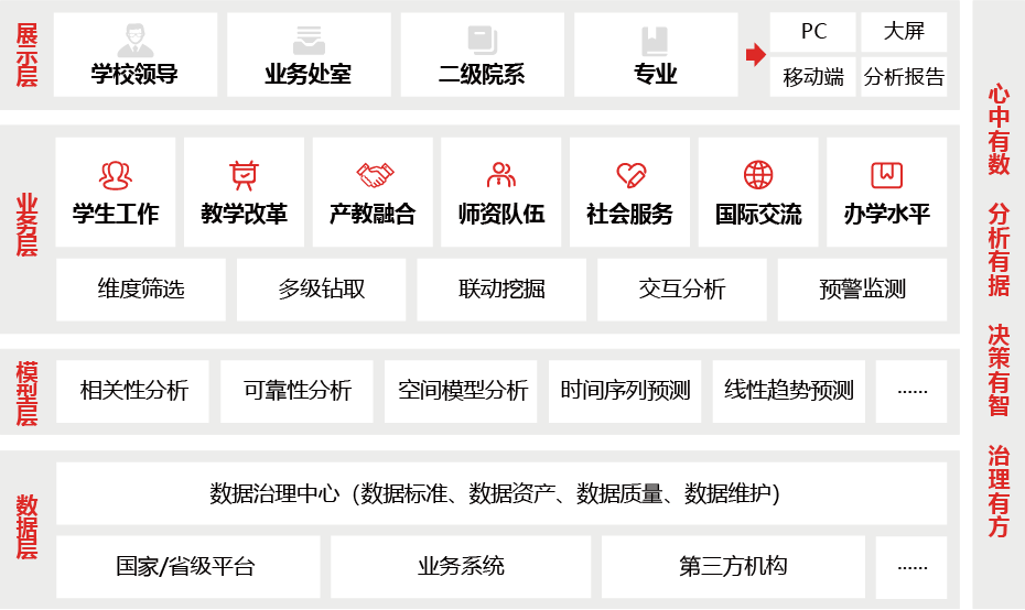 高職院校數(shù)據(jù)決策平臺是點(diǎn)為公司旗下品牌產(chǎn)品。產(chǎn)品基于院校各部門、辦學(xué)全過程的核心管理業(yè)務(wù)需求設(shè)計開發(fā),是集學(xué)生工作、教學(xué)改革、產(chǎn)教融合、師資隊伍、服務(wù)能力、國際交流和辦學(xué)水平七大系統(tǒng)于一體的數(shù)據(jù)決策平臺。產(chǎn)品以實現(xiàn)心中有“數(shù)”、分析有“據(jù)”、決策有“智”、治理有“方”為宗旨,運(yùn)用大數(shù)據(jù)可視化交互式技術(shù),把數(shù)據(jù)“放出來”、使數(shù)據(jù)“動起來”、讓數(shù)據(jù)“用起來”,助力職業(yè)院校治理模式從經(jīng)驗決策向數(shù)據(jù)驅(qū)動轉(zhuǎn)變,提升決策的科學(xué)性和數(shù)智化治理水平,實現(xiàn)治理能力與治理水平現(xiàn)代化。
